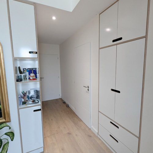 Agencement d'une entrée en contreplaqué filmé blanc.