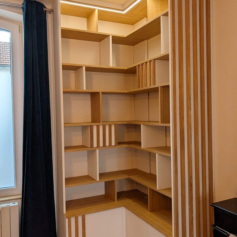 Réalisation d'une bibliothèque d'angle laqué blanc et chêne.